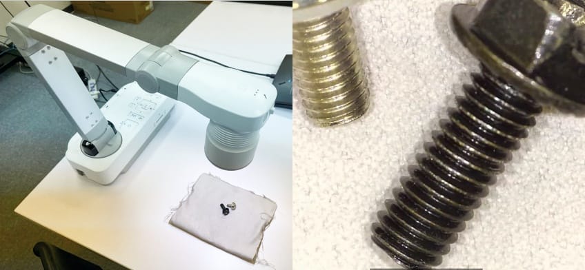 パッケージの破損状況の報告や破損部品を見ながら打合せ、解れた部分の確認をすることができます。上記写真は長さ3cmほどのネジの拡大写真です。